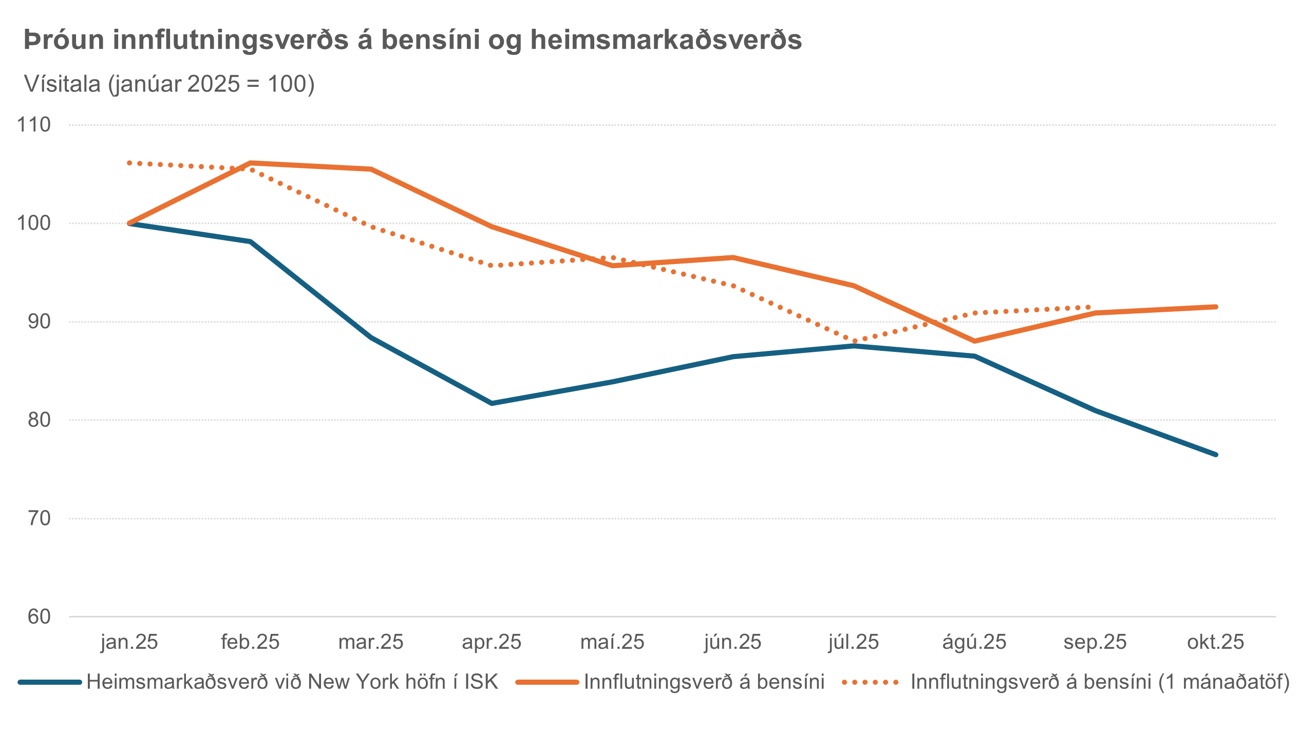 Þegar árið 2025 er skoðað sérstaklega virðist sambandið á milli þróunar á heimsmarkaðsverði og innflutningsverðs á bensíni sem er flutt inn frá Noregi vera veikara en að jafnaði á tímabilinu 2023–2024. Í október hafði heimsmarkaðsverð til að mynda lækkað um 23% frá ársbyrjun á meðan innflutningsverð á bensíni frá Noregi hafði lækkað um 9%. Þetta misræmi kann að skýrast að hluta til af töf vegna flutnings– og afhendingartíma á eldsneyti til Íslands en líkt og sjá má á myndinni er áfram töluverður munur milli heimsmarkaðsverðs og innflutningsverðs með mánaðartímatöf. Það bendir til þess að fleiri þættir en þróun heimsmarkaðsverðs hafi áhrif á innflutningsverð á bensíni frá Noregi.