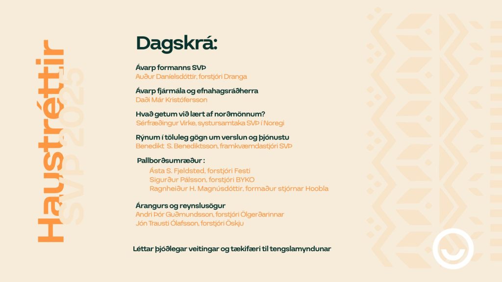 Rétt eins og í haustréttum landsbyggðarinnar er markmiðið að smala saman, taka stöðuna og horfa fram á veginn. Á fundinum koma fram öflugir fulltrúar atvinnulífsins, stjórnmálanna og alþjóðlegra systursamtaka. Þar verða kynnt ný gögn um stöðu greinarinnar, rætt um forystu og framtíð, og deilt reynslusögum sem varpa ljósi á möguleika íslenskra fyrirtækja á alþjóðavísu.